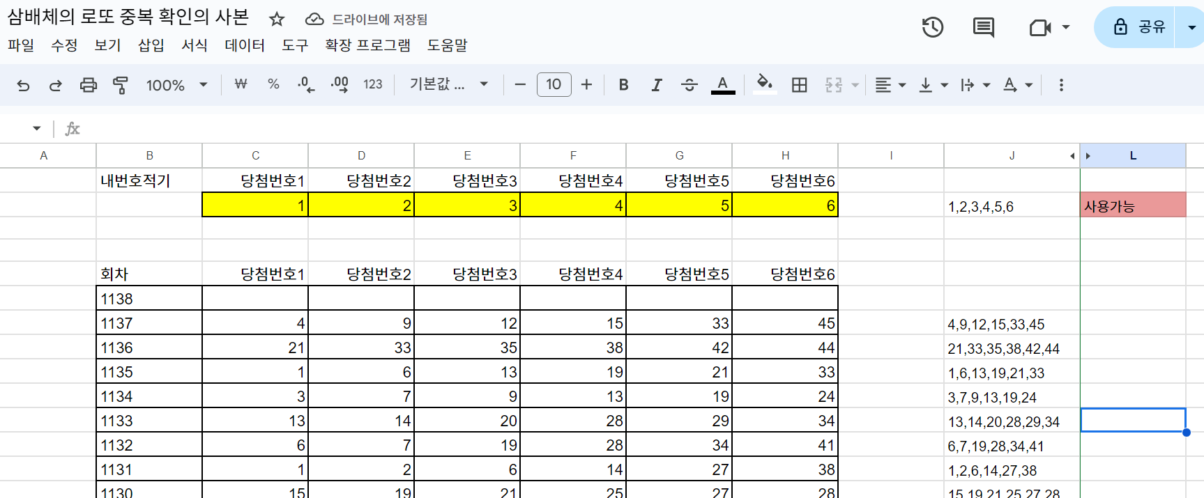 그렇다면 J2 에 본인의 숫자가 입력되는데요. 이때 L2 의 값이 중복이라고 나오면 여태까지 회차에 중복된 번호가 있다는 뜻힙니다.