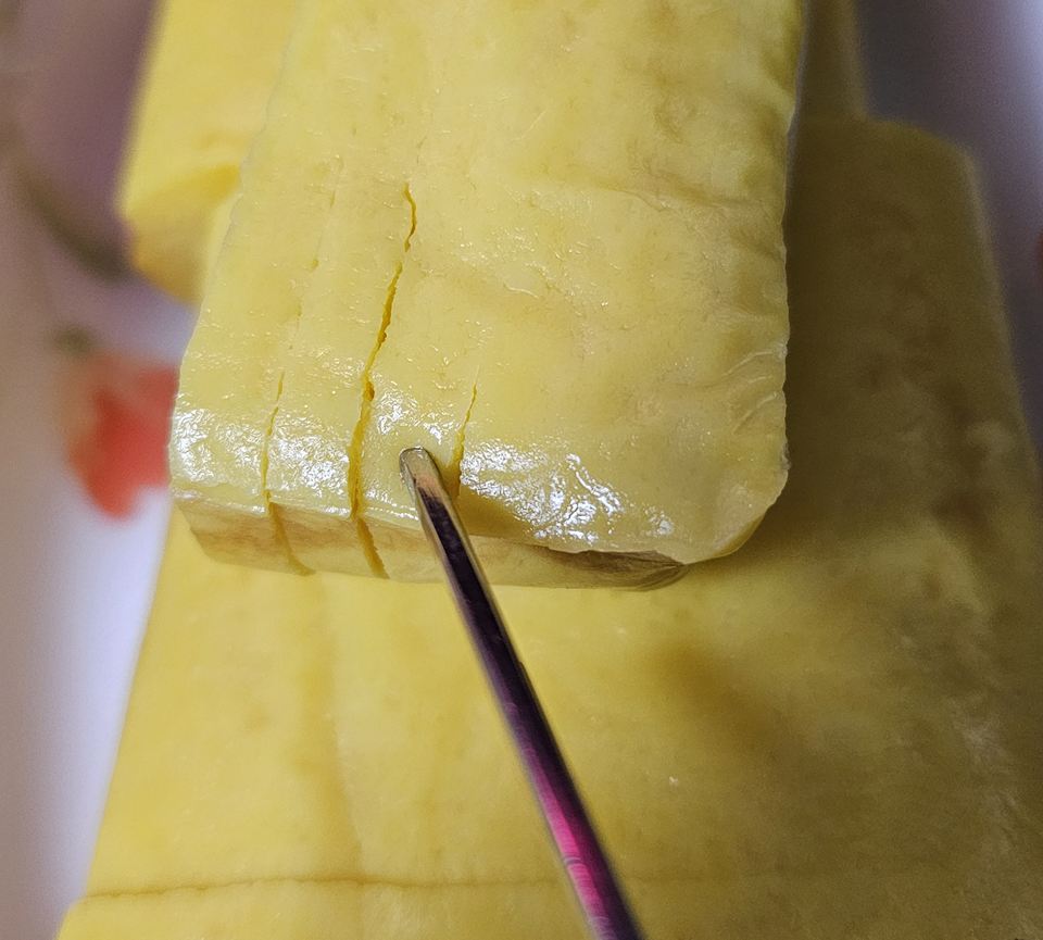 비닐을 벗기고 겉으로만 보면 그냥 커다란 계란 한 덩어리 같지만, 젓가락으로 툭툭 건드려보면 이미 초밥용으로 얇게 다 슬라이스가 되어 있어서 엄청 편합니다.