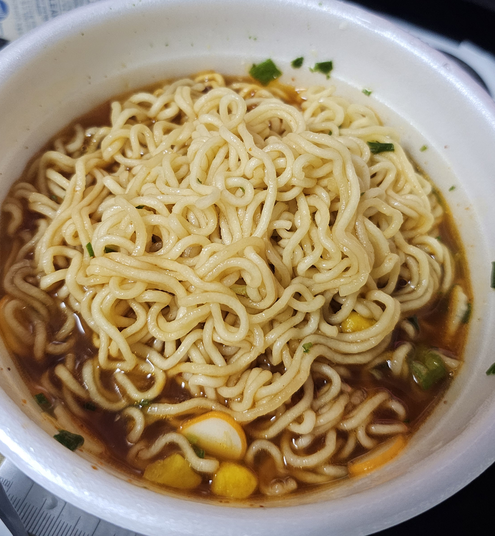 계란초밥이 아무리 상온에 두었다고 해도 기본적으로 차가운 음식이다 보니, 속을 뜨끈하게 데워줄 국물이 하나 필요하더군요. 이럴 땐 역시 만만한 육개장 사발면이 최고입니다. 물 붓고 후루룩 끓여왔습니다. 헤헤.