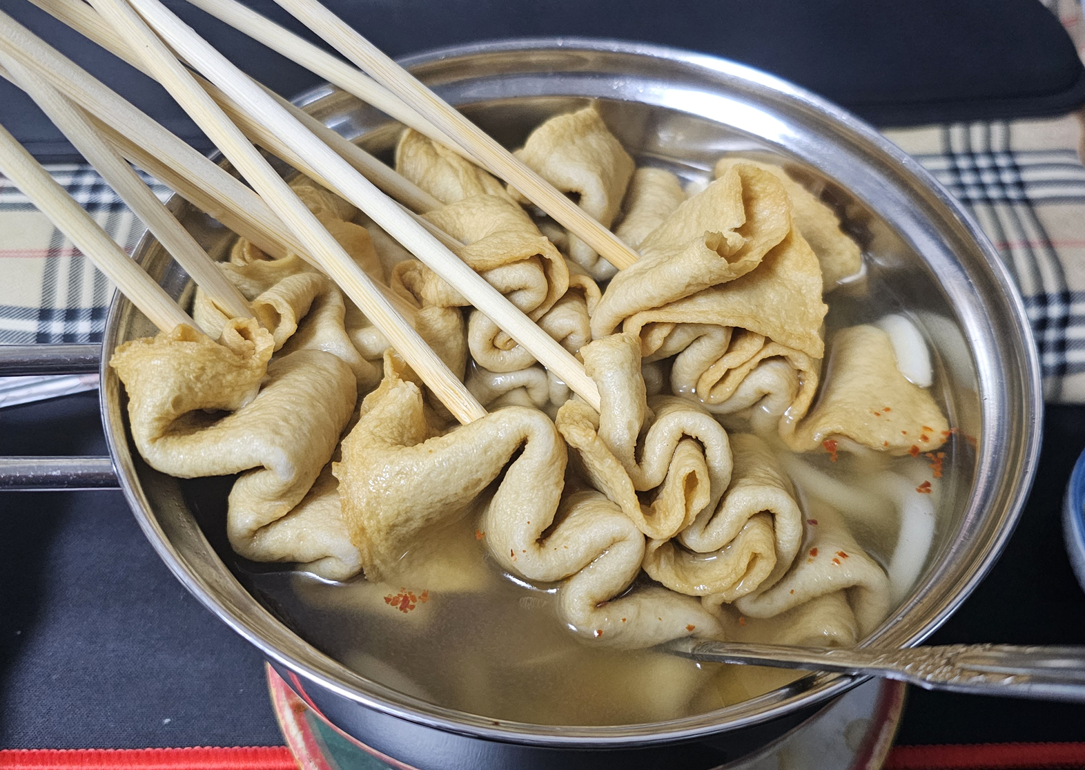 꼬치 끝부분은 깊이 때문에 잘 안 익어서 숟가락이나 젓가락으로 물에 잠기게 눌러줍니다.
