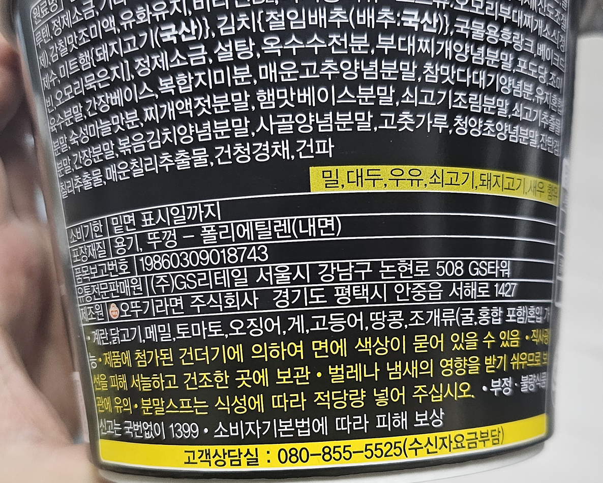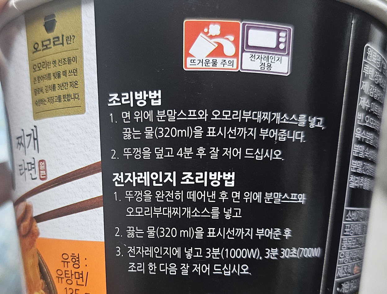 GS25 PB상품으로 오뚜기와 협업해 나온 라면입니다. ‘오모리’는 김치를 숙성시키는 저장고를 의미한다고 하네요. 오모리 시리즈 중 하나로 부대찌개 맛을 낸 컵라면인데, 소세지·햄 건더기가 조금 들어가 있습니다.