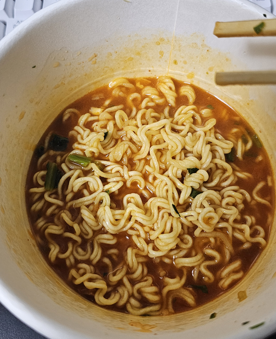 완성 후 휘적휘적 저어봤는데, 스프가 면 위에 뭉쳐 살짝 지저분하게 보이긴 했습니다. 그래도 맛은 평범한 ‘부대찌개라면 맛’. 크게 특별히 맛있다거나 나쁘다거나 하진 않네요. 소세지와 햄은 조금 들어있는데 양은 적습니다. 그래도 가격 대비 간단히 즐기기엔 나쁘지 않음!