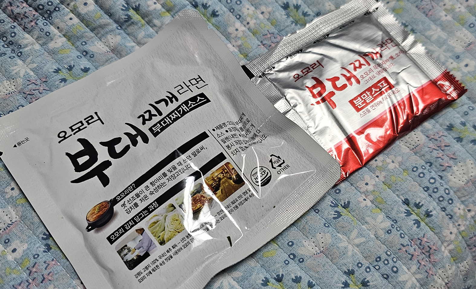 뚜껑을 열면 분말스프 + 부대찌개 소스 이렇게 두 가지가 들어있습니다. 파 같은 건더기는 별도로 들어있지 않고 면에 바로 포함된 형태예요.