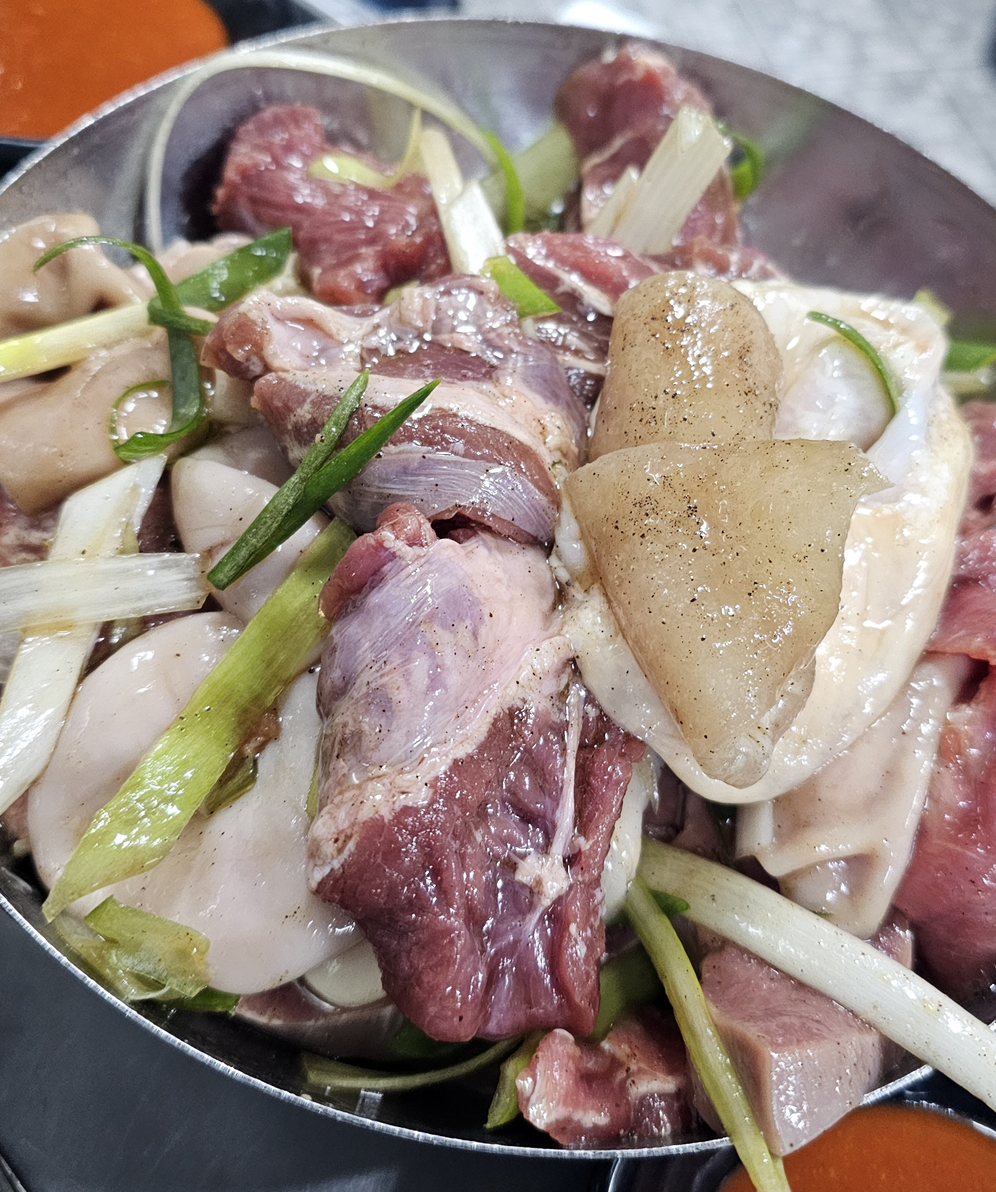 저희는 갈매기살, 아구살, 막창, 애기집, 감투, 염통, 껍데기가 섞인 고기 모둠 한 대접으로 주문했습니다.
