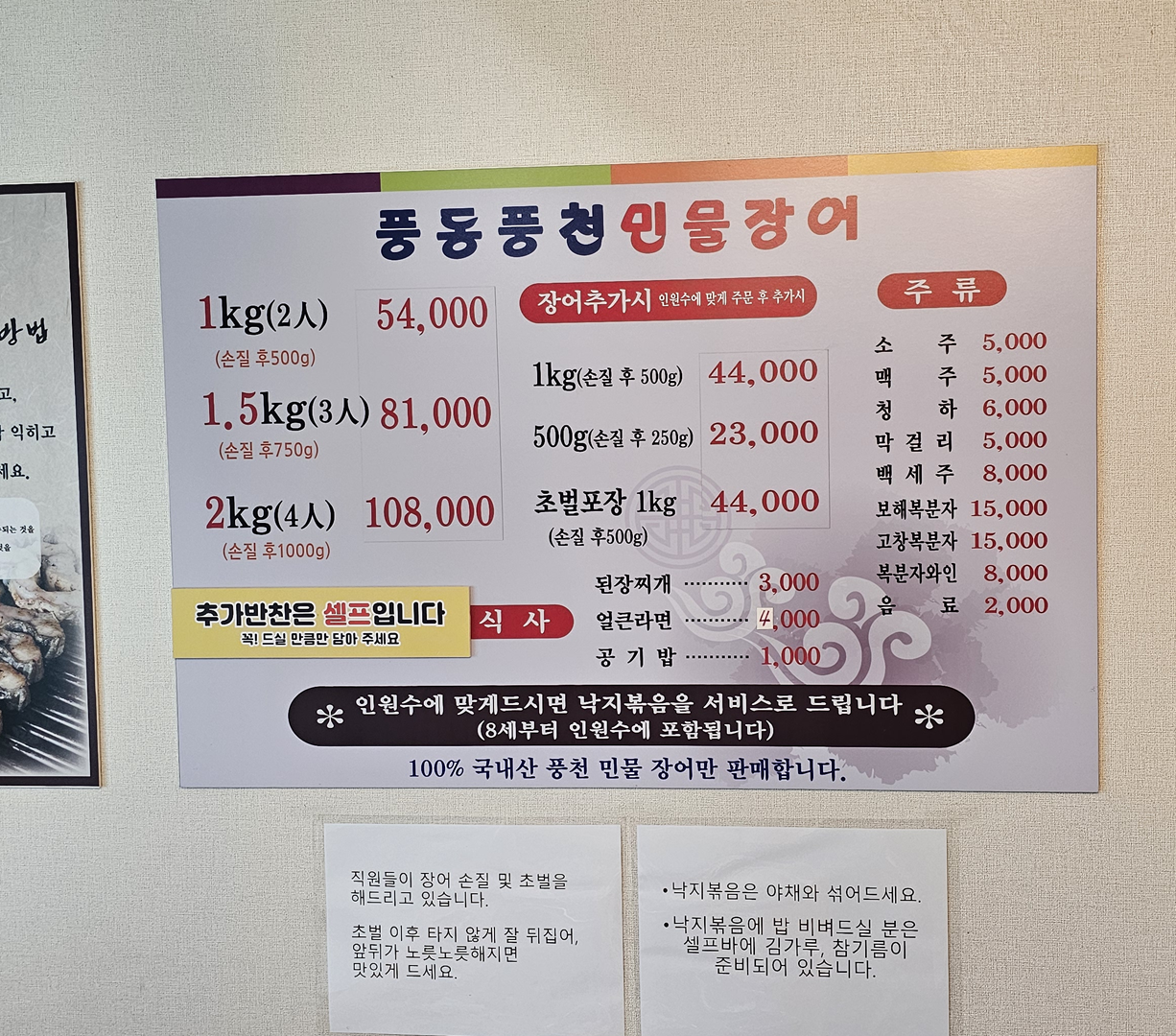 - 장어: 1kg 5.4만 원 (손질 후 500g = 2인분)