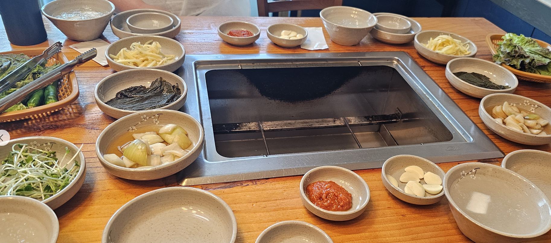 자리에 앉으면 동치미, 양파절임, 깻잎장아찌, 무순, 마늘, 쌈장, 상추, 고추, 생강, 장어소스 등 밑반찬이 세팅됩니다. 셀프바에서는 김가루와 참기름도 가져다 먹을 수 있습니다.