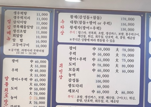 황제의바다는 스끼다시가 나오는 귀빈상도 있지만, 포장 메뉴는 따로 ‘알뜰회’만 가능합니다. 구성은 회 + 매운탕 + 해물인데요. 저는 광어+우럭 중자(45,000원)를 포장했습니다. 요기요에도 등록은 되어 있는데 영업 준비중으로 떠서 직접 전화 주문했습니다.