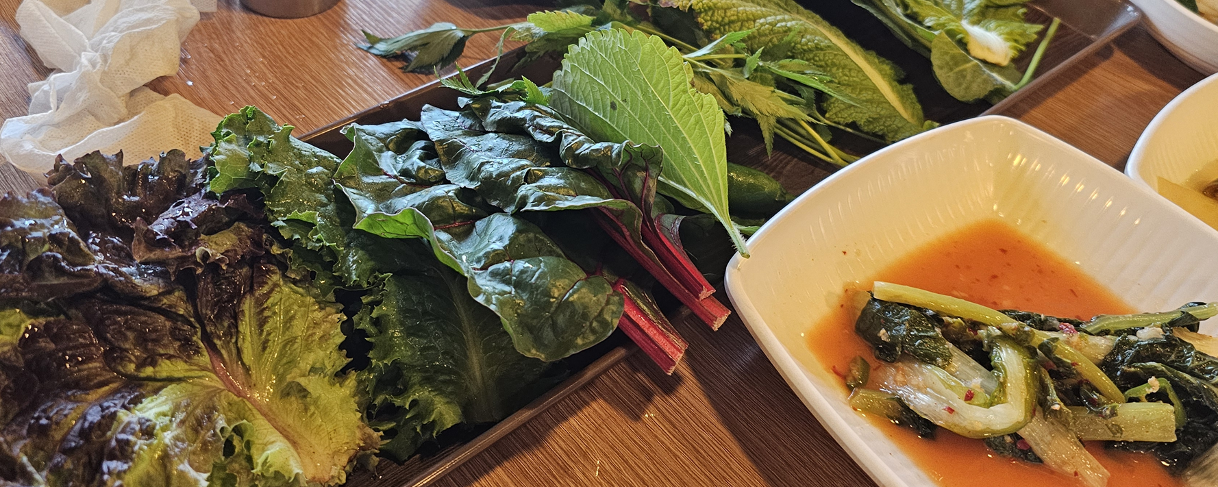 쌈 채소는 전문 쌈밥집 수준은 아니지만 다양했고, 셀프바에 고수가 있다는 점이 인상적이었어요.