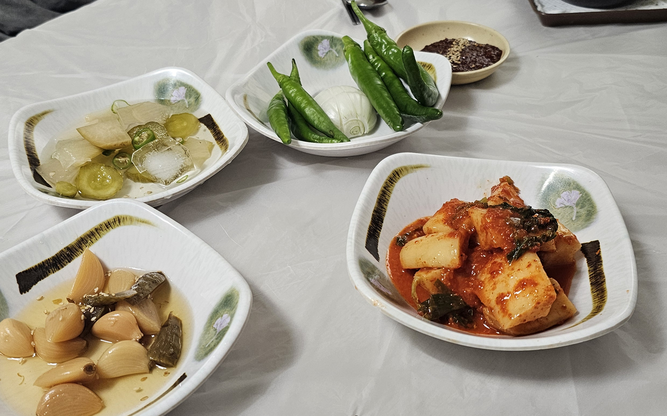기다리면서 총각김치, 마늘짱아치, 오이지냉국, 고추, 마늘, 집된장 등