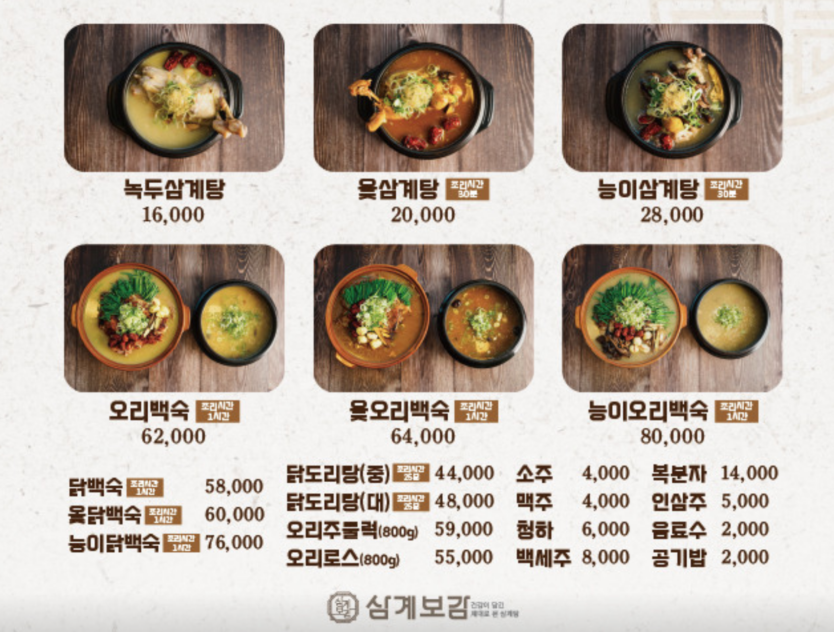 - 삼계탕 (일반, 옻, 능이버섯 등 옵션 추가 가능)