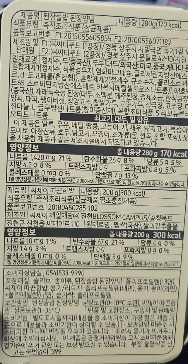 - 된장국은 전용 포장뚜껑을 씌워 전자렌지에 따로 조리해야 합니다.