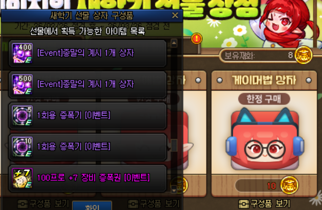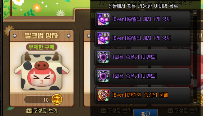 우선 새로 시작한 스노우메이지의 새학기 선물 상점 이벤트에서 프로게이머법 상자를 까면 1회용 증폭기를 총 15개 얻을 수 있습니다.여기에 매일 1회씩 랜덤하게 뽑을 수 있는 밀크법 상자에서도 1회용 증폭기를 1개에서 최대 3개까지 추가로 얻을 수 있습니다.