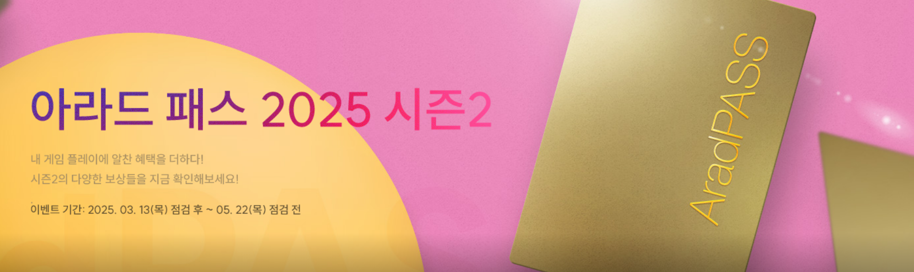 '아라드 패스'는 계정당 29,800세라로 구매할 수 있는 시즌 패스입니다. 이번 시즌의 기간은 2025년 3월 13일 점검 후부터 2025년 5월 22일 점검 전까지 약 69일간 진행됩니다.