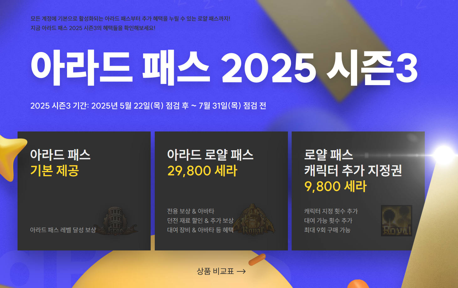 '아라드 패스'는 계정당 29,800세라로 구매할 수 있는 시즌 패스입니다. 이번 시즌의 기간은 2025년 5월 22일 점검 후부터 2025년 7월 31일 점검 전까지 약 71일간 진행됩니다. 2달하고 10일정도 더 하는건데요.상당히 긴 기간이긴 합니다.