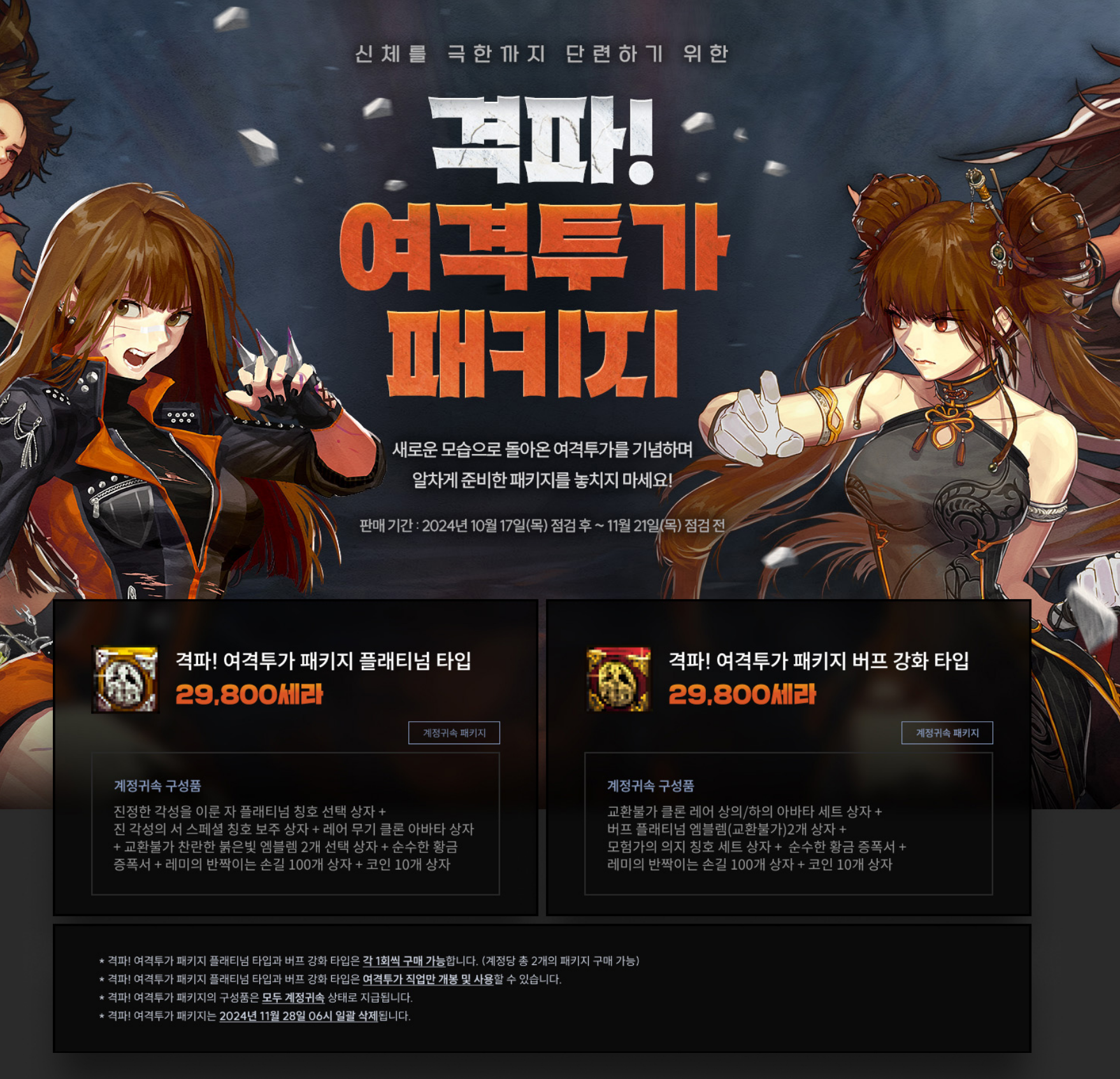 - 격파! 여격투가 패키지 플래티넘 타입: 전용 칭호, 아바타 세트, 추가 혜택 포함