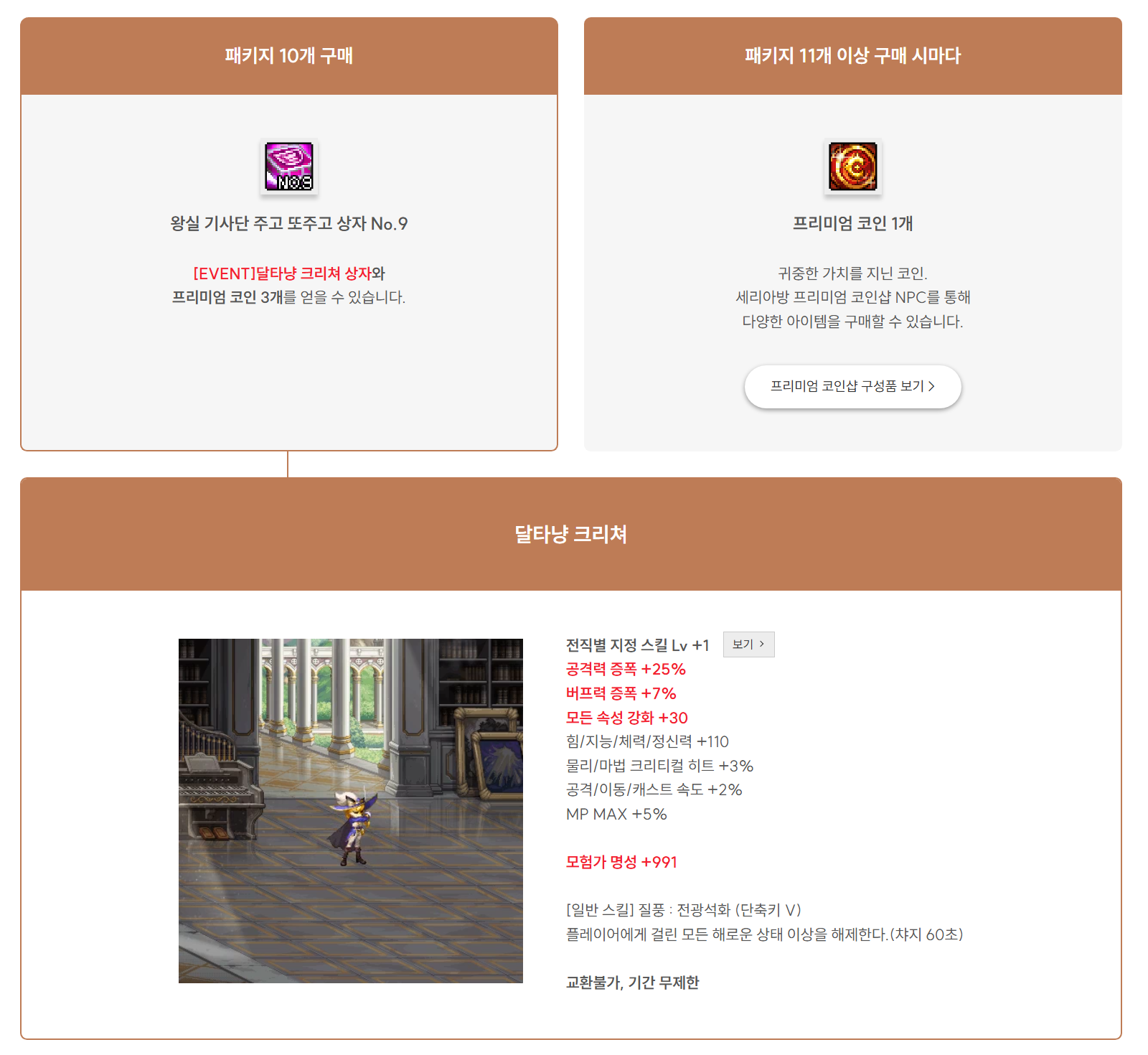 - 패키지 3개 구매시 = 왕실 기사단 크리쳐 상자 + 프리미엄 코인 2개