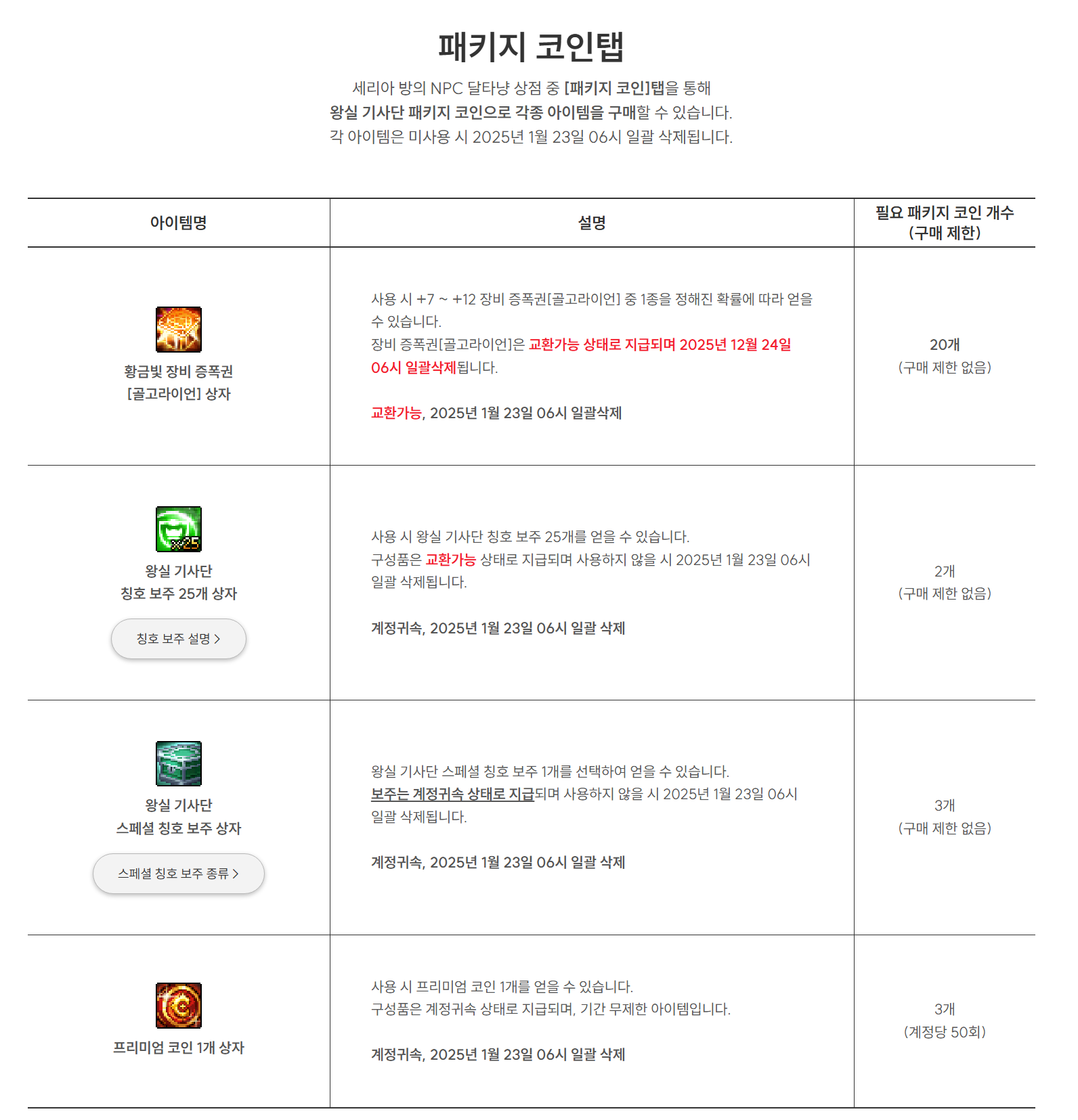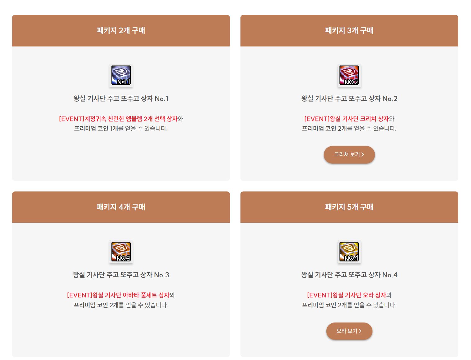 - 패키지 5개 구매시 = 왕실 기사단 오라 상자 + 프리미엄 코인 2개