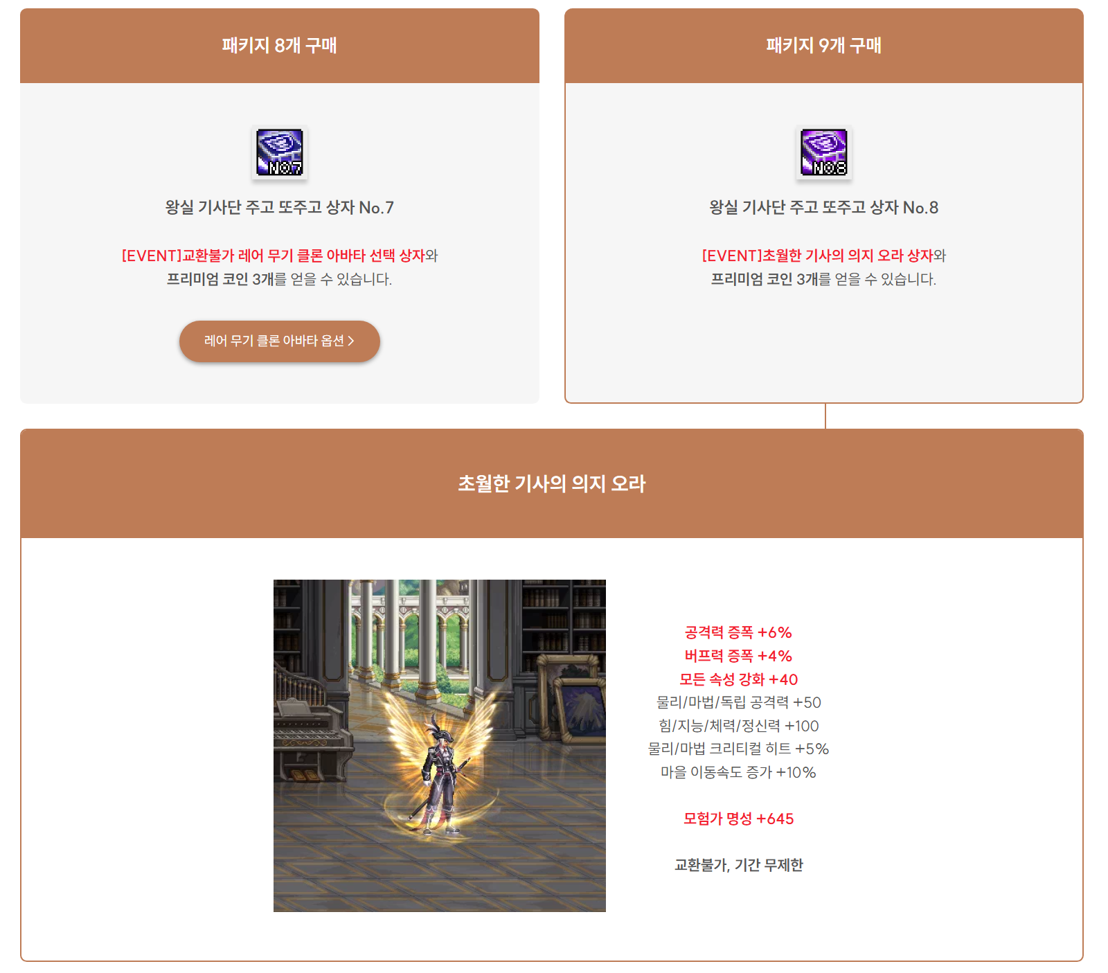 - 패키지 9개 구매시 = 초월한 기사의 의지 오라 상자 + 프리미엄 코인 3개