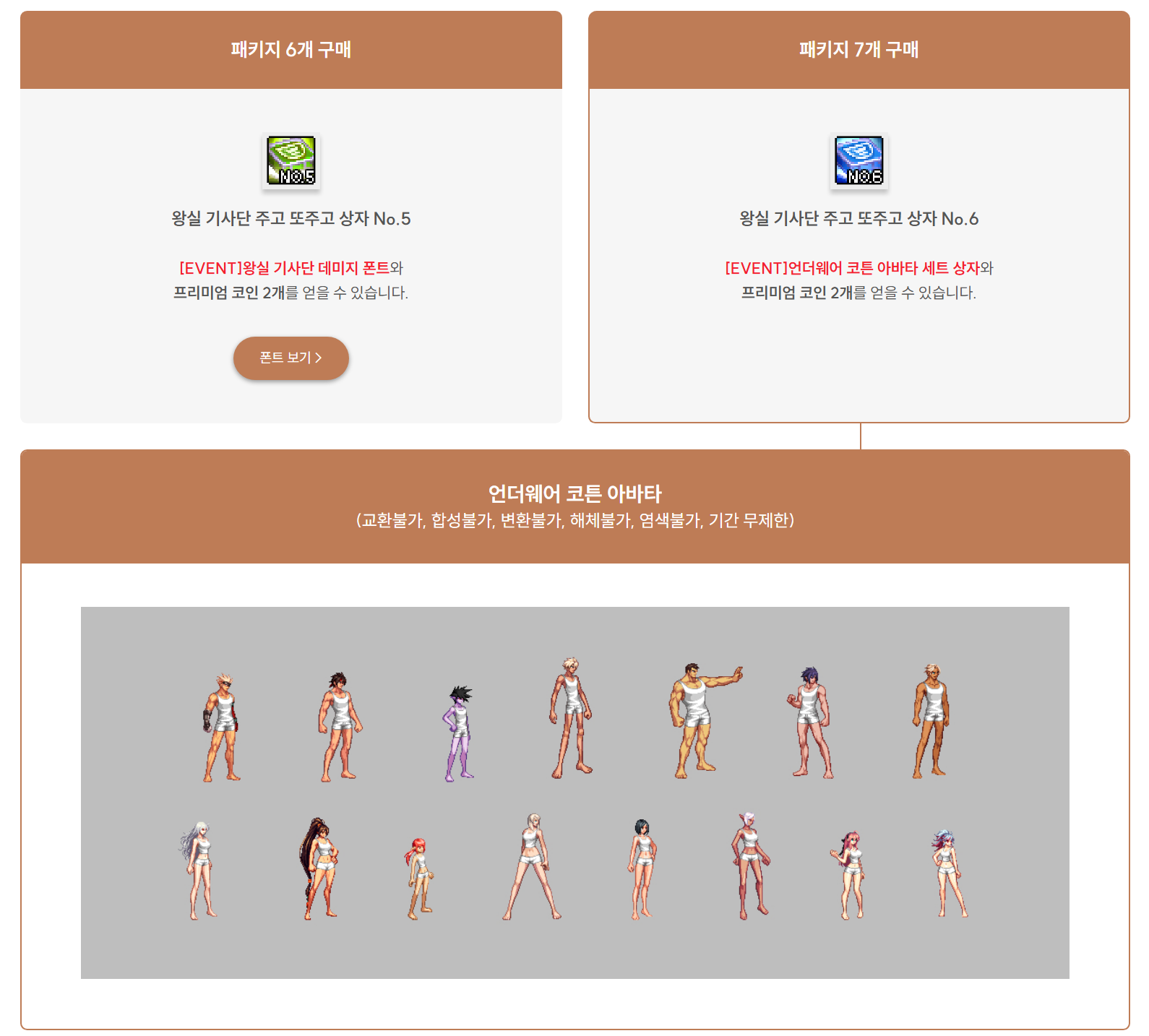 - 패키지 6개 구매시 = 왕실 기사단 데미지 폰트 + 프리미엄 코인 2개