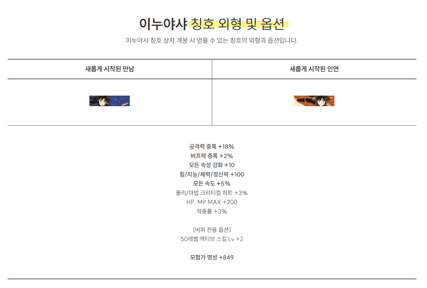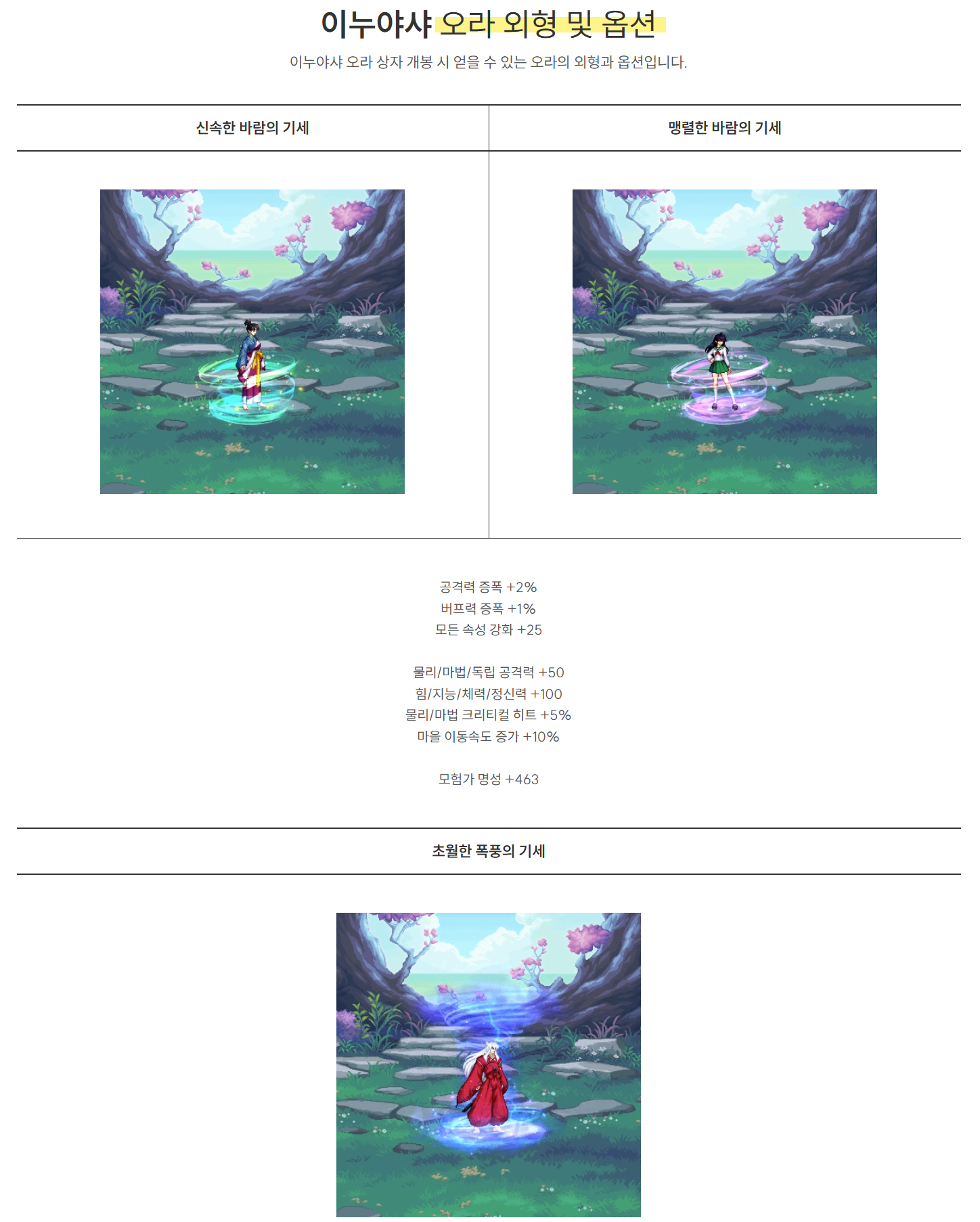 이번 이누야샤 콜라보 패키지는 지난 프로스트 킹덤때와 같은 39200세라에 아바타,칭호,크리쳐,오라,세라 상자로 구성되어있습니다. 첫구매 혜택으로는 버프스킬강화용 +3레벨 칭호가 지급됩니다.