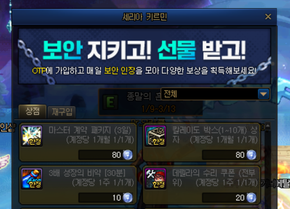 - 보안상점: 보안 지킴이 선물 상자 주 5회