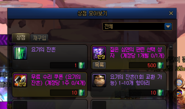 재화던전인 요기 추적 을 던면 판당 무료 수리 쿠폰 을 구매할수 있는 요기의 잔흔 이라는 재료를 얻을수 있습니다. 이건 옛날 폭풍성 이나 지난 카지노에서 얻을수 있었던 균열의 단편 을 대체하는 재료입니다. 계정당 주에 4개의 수리쿠폰을 얻을수 있는데요. 아이콘은 잊땅의 아이콘을 대체한것을 알리듯 똑같은 아이콘 입니다. 대신 전부위를 수리할수 있습니다. 이건 월말까지 라는 사용기한이 있으니 무조건 1순위로 사용하시는걸 권장드립니다.