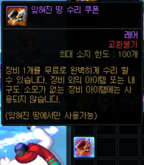 2014년 2월 6일에 추가된 특수 던전인 ‘잊혀진 땅’에서는 수리 쿠폰을 활용해 장비를 무료로 수리할 수 있었습니다. 하루에 한 번만 사용할 수 있었지만, 광부 작업 후 피로도를 모두 소진하면 이 쿠폰으로 마무리하는 것이 일반적인 방법이었죠.