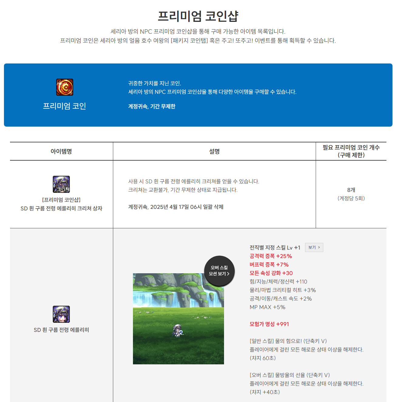 | 칭호 상자 | 2240만 골드 | 세리아급 또는 신규 종결 뽑기 |