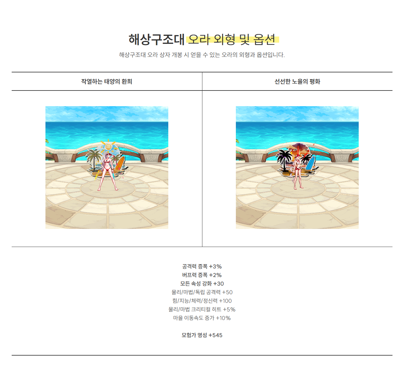 오라상자를 통해 작열하는 태양의 환희 , 신선한 노을의 평화 두가지 오라중 하나를 선택해서 받을수 있으며 옵션은 동일하고 외형만 (색상만) 다른 오라입니다.