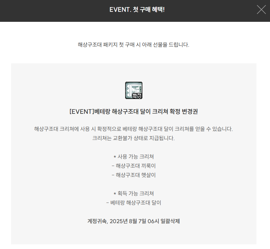 | 베테랑 해상구조대 달이 크리쳐 확정 변경권 | 약 2000만 골드 | 첫 구매 혜택 |