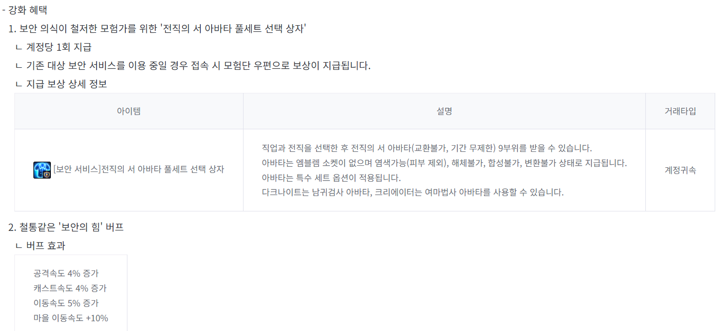 OTP를 이용해서 보안수준을 중렙이상 달성한 계정은 전직의서 아바타 풀세트 선택 상자 와 보안의힘 버프를 받습니다.