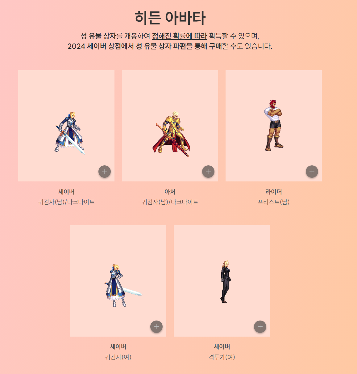 어디선가 보셧을듯한 아바타 맞죠?? 예전에는 패키지 10개를 사면 얻을수 있었던 히든 아바타 인데...이제는 그냥 뽑아야하는...그런 히든아바타 입니다. 노릴것은 남귀검 , 여귀검 의 세이버 아바타 압니다. 그외의 히든은 그럭저럭 가격이라...뽑기에 얼마나 투자했느냐를 따져봐야하거든요....
