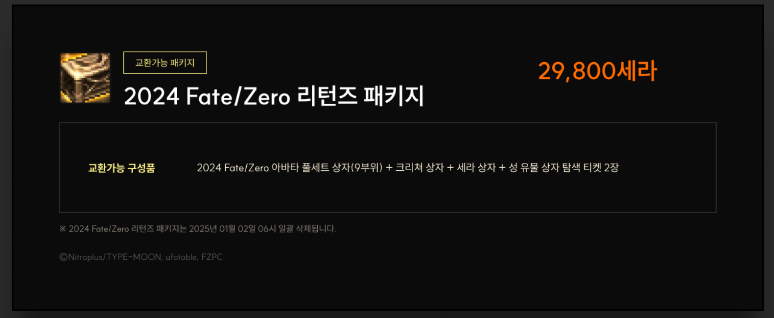 던파 던전앤파이터 2024년 12월 5일 신규패키지 Fate/Zero 리턴즈 패키지