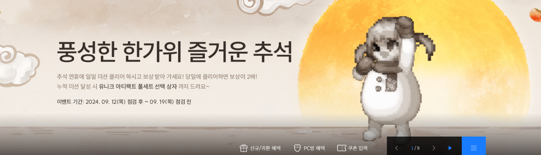 24년 9월 12일 점검 후 ~ 24년 9월 19일 점검 전 까지 딱 1주일 진행하는 추석 이벤트 입니다.