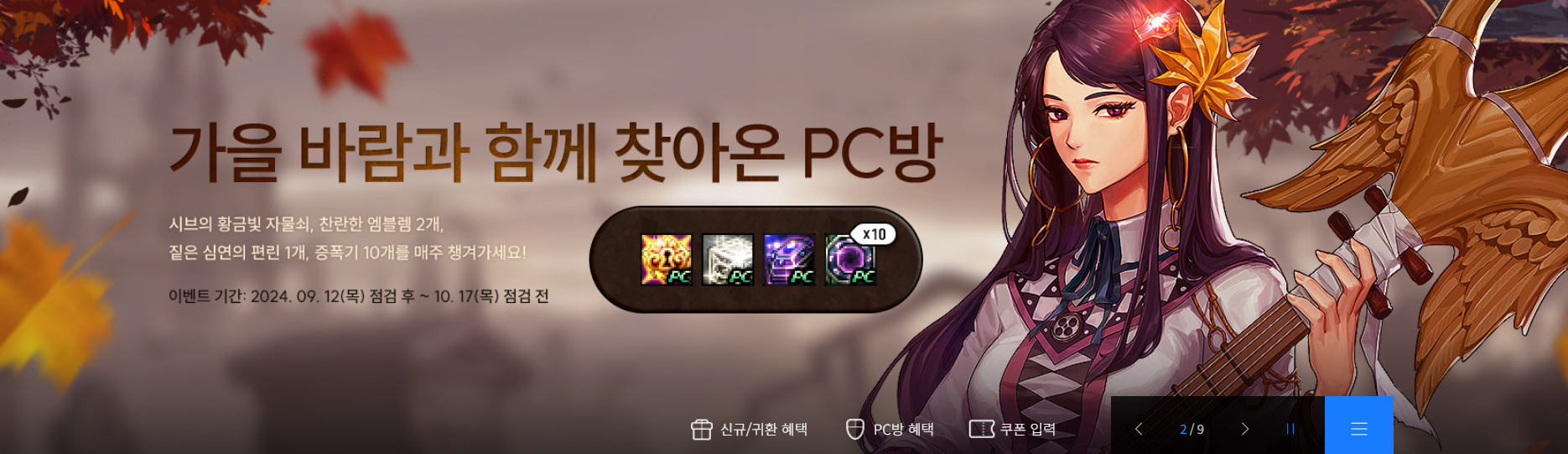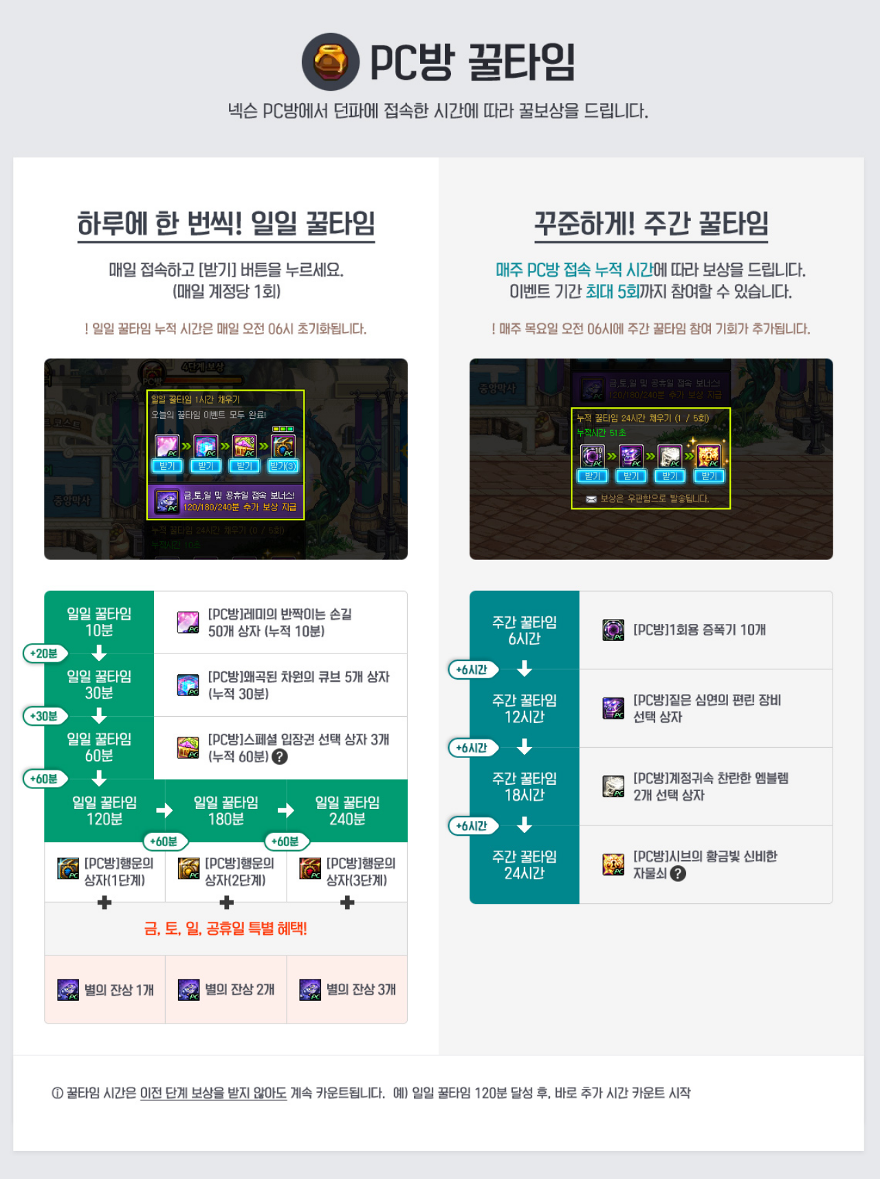 24년 9월 12일 점검 후 ~ 24년 10월 17일 점검 전 까지 진행되는 PC방 누적 사용 시간 이벤트 입니다.