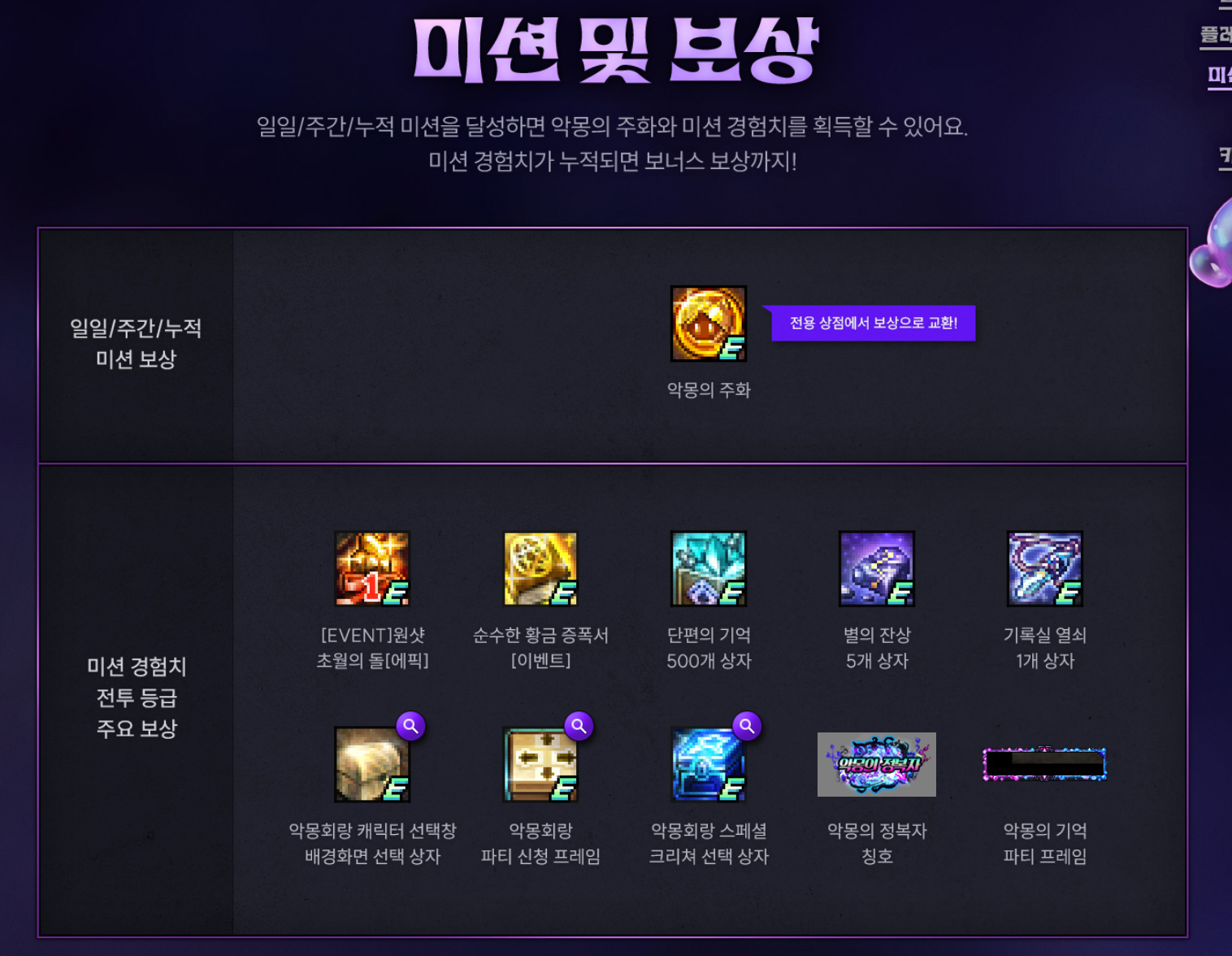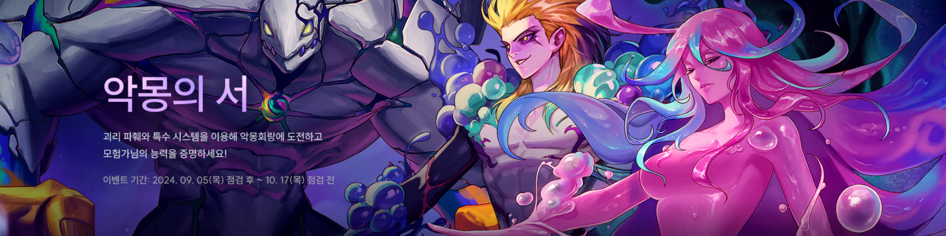 24년 9월 5일 점검 후 ~ 24년 10월 17일 점검 전 까지 특수 던전인 악몽의 서 을 클리어 하는 미션의 이벤트 입니다.
