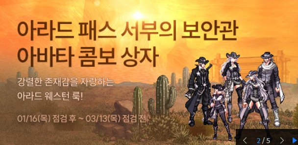 25년1월16일 점검 후 ~ 25년2월6일 점검 전 까지 판매하는 이벤트 패키지로 25년1월 아라드 패스에서 지급하던 아바타 서부의 보안관 아바타가 단독으로 출시했습니다. 12900세라 에 판매하고 구성 피부포함 9부위 교환가능 아바타 와 엠블렘 소캣 생성기[피부] 가 서부의 들어있는 보안관 보너스 상자를 얻을수 있습니니다.