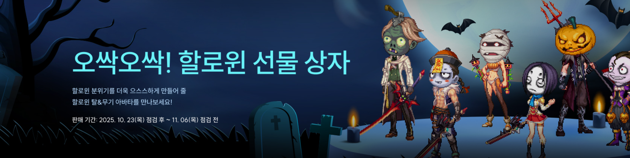 2025년 10월 23일 점검 후 ~ 2025년 11월 5일 점검 전 까지 진행되는 이벤트 패키지 로 할로윈 탈 아바타상자 + 무기아바타 상자 구성을 3900세라에 판매하며 계정당 4회 구매가 가능합니다.