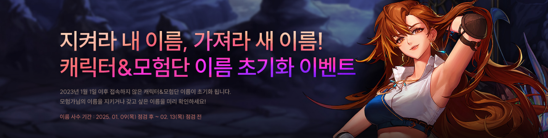 25년1월9일 점검후 ~ 25년 2월 13일 점검 전 까지 진행하는 이벤트로 최근접속이 없는 케릭터 , 모험단 이름을 회수해서 새로 신청사용하게 하는 이벤트 입니다. 23년1월1일 이후 접속기록이 없는 케릭터 , 모험단 이름이 대상으로 25년 2월13일까지 접속이 없을경우 이름을 빼앗기게(?) 됩니다. 해당기간동안 초기화대상의 이름을 검색해볼수 있으며 노리는 이름은 25년 2월13일 오후8시 이벤트창으로 통해 받을수 있는 이름 변경권으로 선착순으로 노릴수 있으니 노리는 이름이 있으신 분들은 꼭 성공하시길...