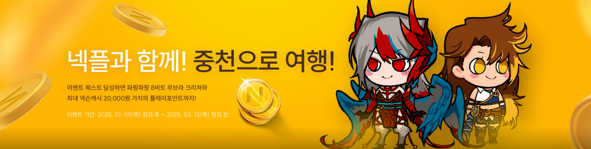 25년1월9일 점검후 ~ 25년 3월 13일 점검 전 까지 진행하는 이벤트로 넥슨플레이 연동한 계정에 한해서 진행되는 이벤트 입니다. 연동후 스타팅 부스트 업 이벤트 지정한 케릭으로 미션당성시 추가 넥슨케시를 얻을수 있습니다. 넥슨계정이 부부계정이다보니 저는 접속시 주는 500캐시만 받고 떨어져야겠습니다.ㅠㅠ 최대 2만원의 넥슨 캐시를 받을수 있으니 신규로 키우시는 분들은 꼭 넥슨플레이를 이용하시기 바랍니다.