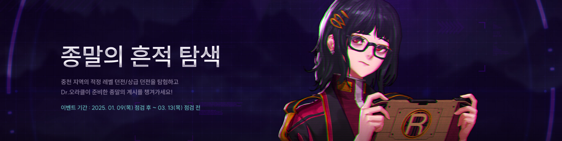 25년1월9일 점검후 ~ 25년 3월 13일 점검 전 까지 진행하는 이벤트로 적정던전 클리어시 떨어지는 종말의 흔적이라는 아이템으로 종말의 계시 상자로 교환하는 이벤트 입니다. 또한 성장 지원이벤트로 111~115레벨 달성시 종말의 계시를 보상으로 지급한다고 합니다.