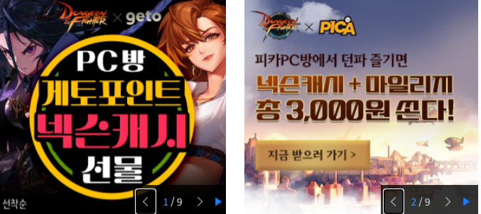 1시간 플레이시 각 가맹pc방의 1000마일리지 , 2시간 플레이시 넥슨캐시 2000원 을 지급합니다.