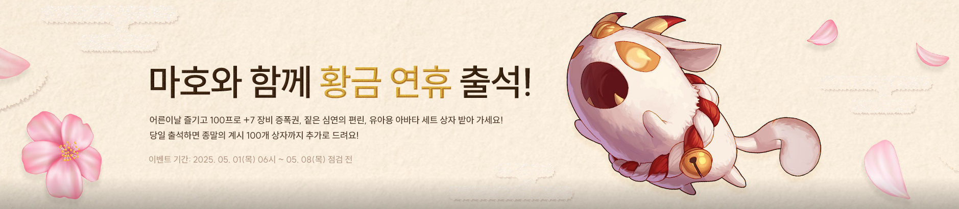 2025년 5월1일 06시 ~ 5월8일 점검 전 까지 진행되는 이벤트로 이벤트기간동안 매일매일 적정던전 4회클리어시 보상을 받을수 있는 출석 이벤트 입니다. 또한 이벤트기간동안 버닝효과를 받을수 있습니다.