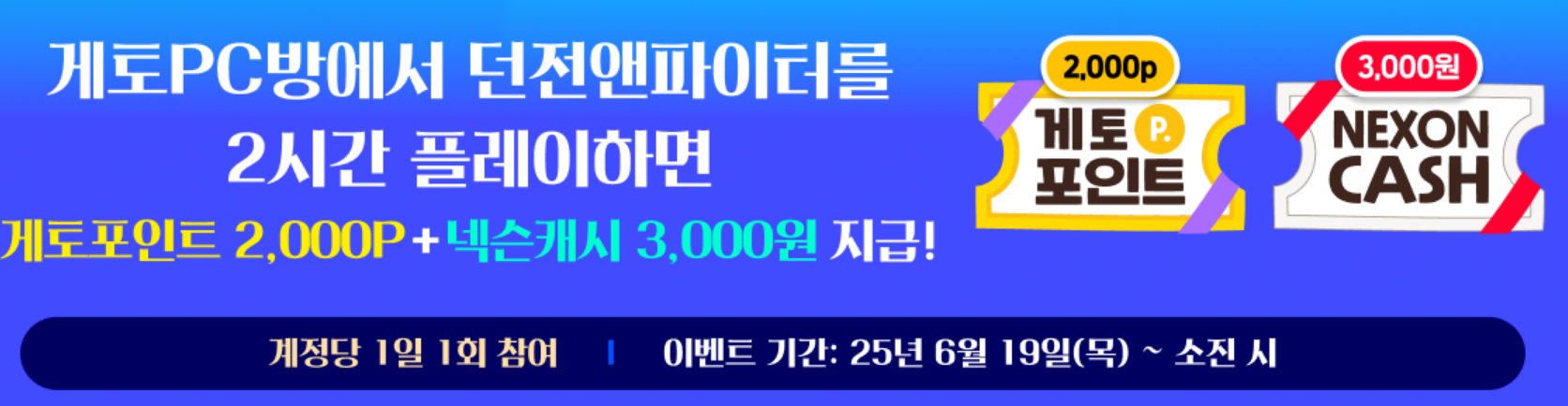 게토 PC방에서 던파2시간 플레이하면 게터포인트2000P + 넥슨캐시 3000원 을 지급하는 이벤트입니다.