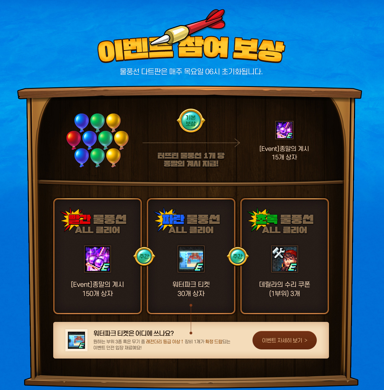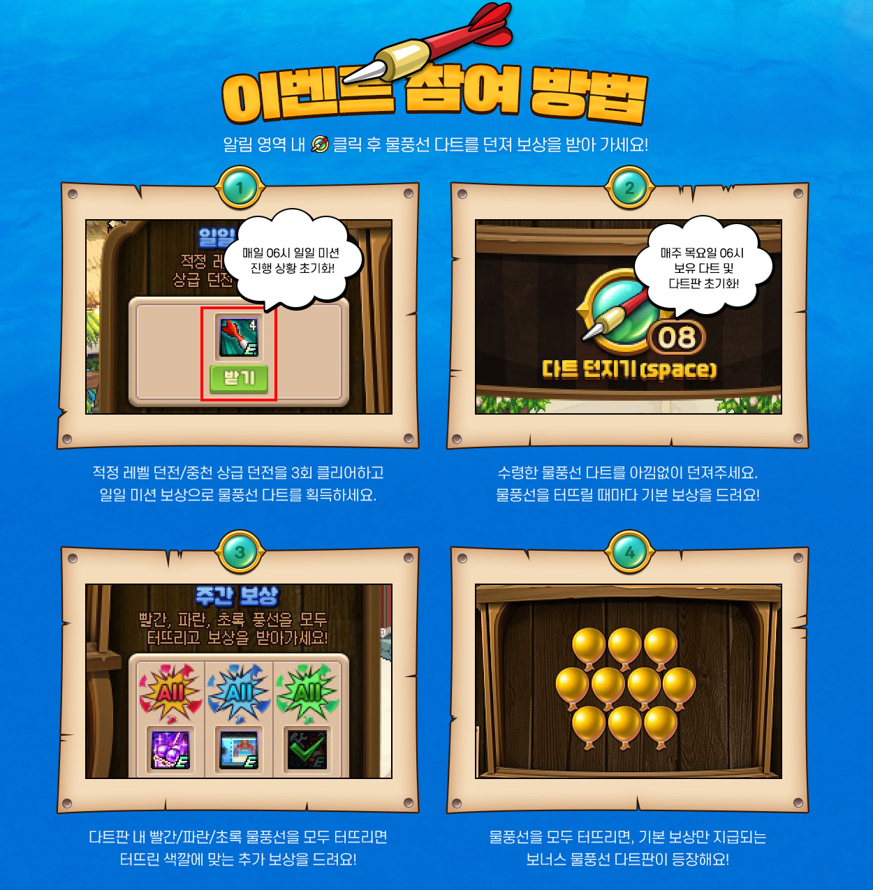 - 매주 목요일 오전 6시, 다트판과 보상이 모두 초기화됩니다.