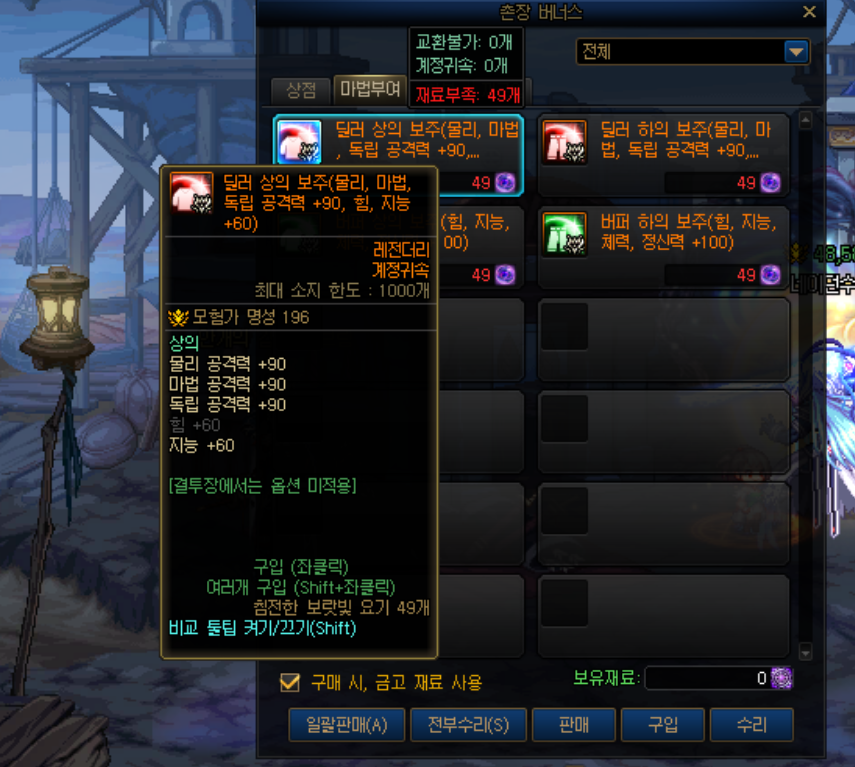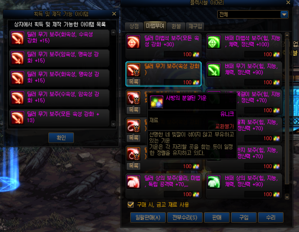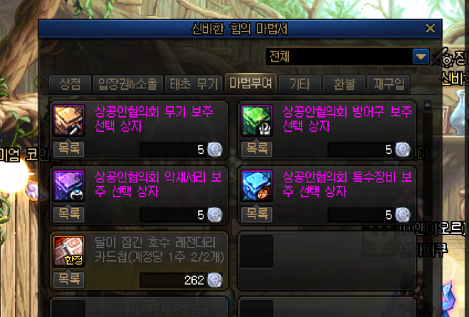 물론, 상공인협의회 은화로 구매할수있는 것들도 존재하는데 큰비용이 아닌 간단한 던전클리어 만으로도 얻을수 있는 마법부여들의 성능이 많이 좋기에 은화는 최소화했습니다.