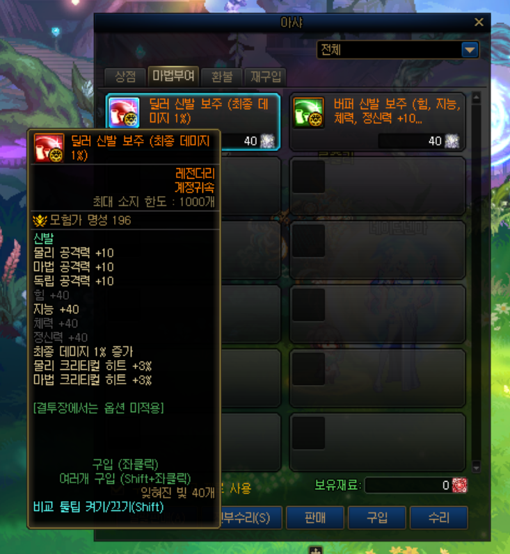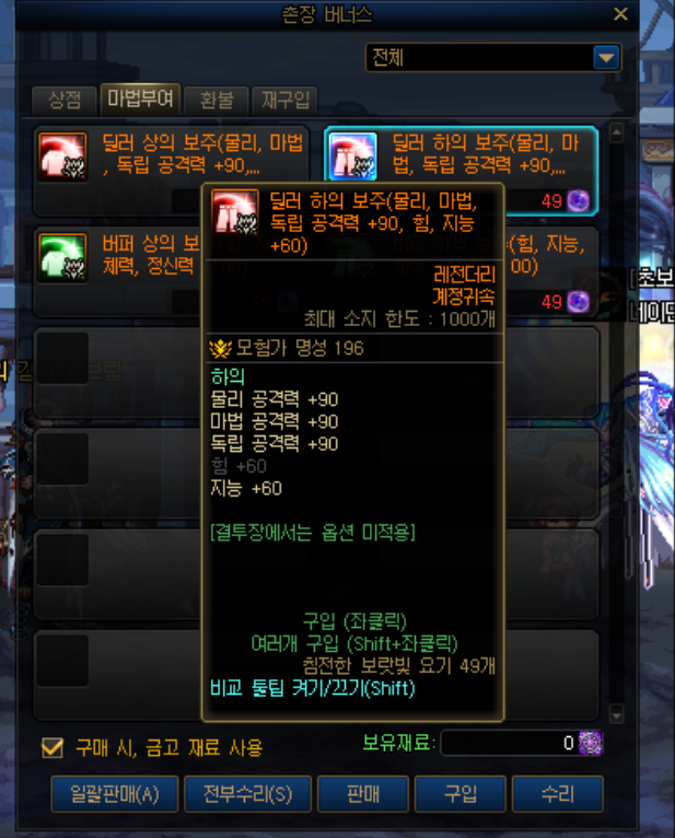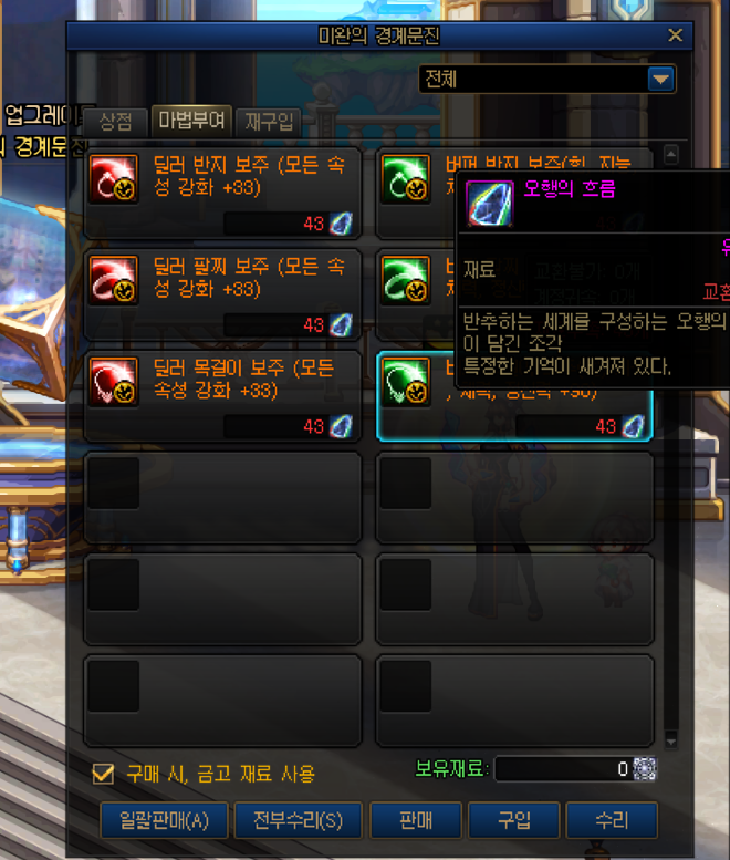 준종결 이자 가성비인 모든속성 강화 33 옵션인 아스라한 보주 입니다. 오행의 흐름 42개로 구매할수 있습니다.