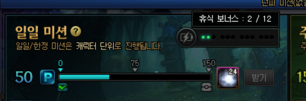 | 일일 미션 휴식 보너스 채우기 | 미션 완료후 보상받지않기 | |