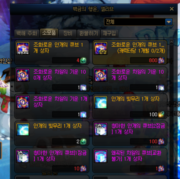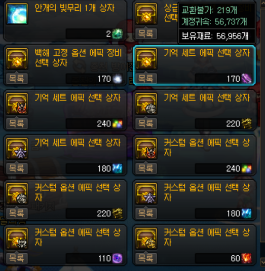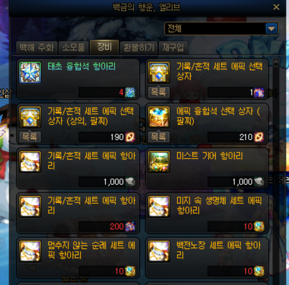 왜차큐를 다 모았다면 엘리브 상점에서 소모품 탭에 있는 조화로운 차원의 기운 1개 상자를 구매합니다. 그리고 장비탭에 있는 기록/흔적 세트 에픽 항아리 를 구매하시면 됩니다. 조화로운 안개의 큐브 도 있다면 역시 세트 에픽 선택 상자로 받아주시구요. 에픽소울 로 상자랑 바꾸는건 주의해주세요. 에픽소울은 중천에서 아주 중요한 재료입니다.