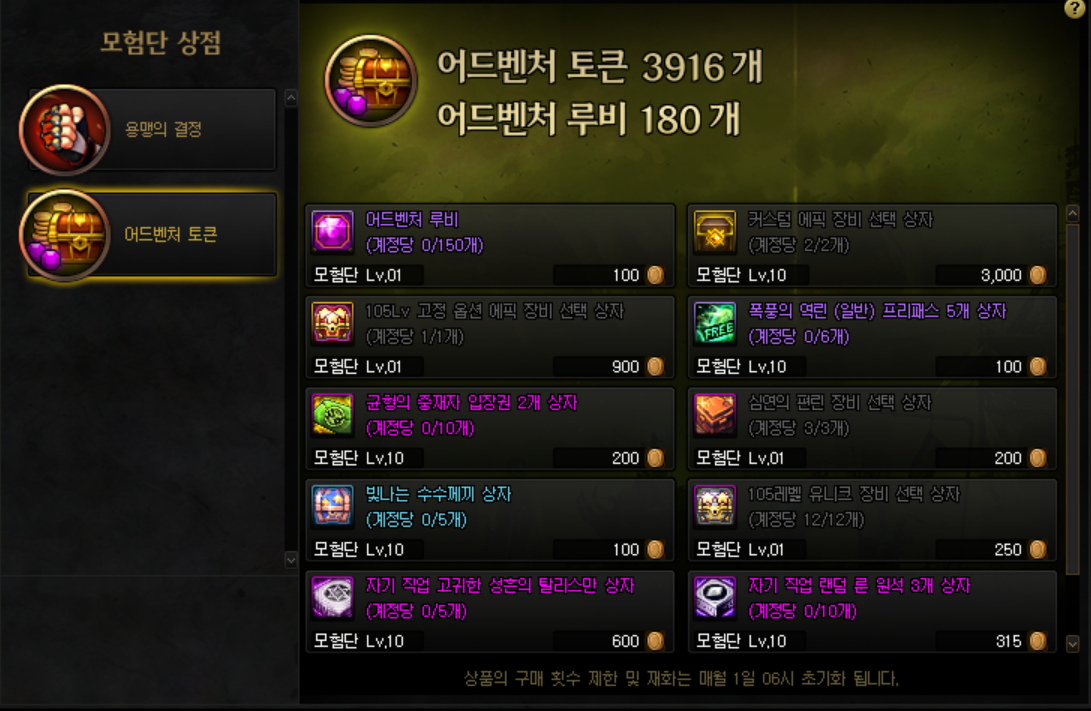 매월 1일이 되면 어드벤처 상점이 초기화됩니다. 25년 1월 1일 이 되면어드벤처 토큰 을 이용해서 상자들 을 구매해줍니다 .에픽상자 , 편린상자, 유니크상자 , 카드첩 , 레전더리 소울 , 강렬한 기운 상자 등을 구매해줍니다.